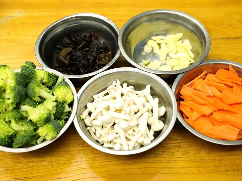 1.准备白玉菇去根洗净,西蓝花去根留朵,胡萝卜切大块后改刀切成菱形片,黑木耳泡水洗净。