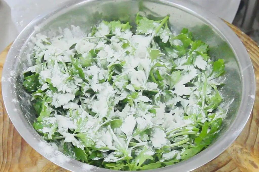1.准备芹菜叶一盆,仔细地清洗干净,捞出后控干水分。首先把芹菜叶拌入植物油,用来锁住芹菜叶的水分,撒入两小把干面粉,颠盆,搅拌均匀。