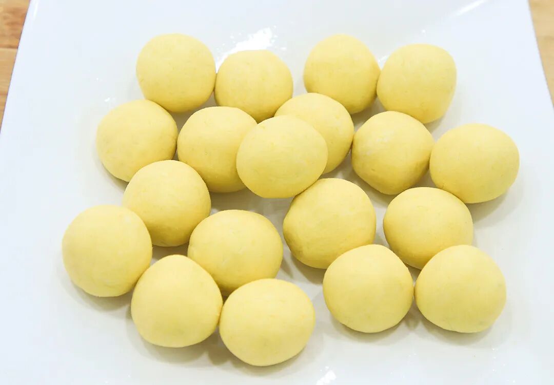 3.团好以后用手揪下一个小面剂子,在手心揉成小圆球,揉成大小均匀的小圆球,把剩下的面团依次揉好放入盘中备用。