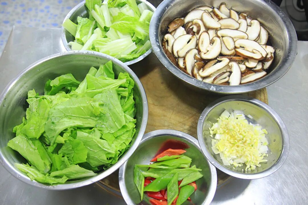 1.香菇去根、切成片,用淡盐水浸泡洗干净;小白菜去根后打散,清洗干净切成段;青红椒都切菱形片用来搭配颜色;另外切点葱花、姜蒜末备用。