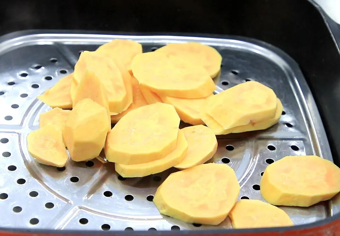 1.准备红薯一块,削去外皮切成片,切得稍微薄一点,蒸的时候节省时间。锅内烧开水,水烧开以后把红薯放入锅中蒸15分钟即可。
