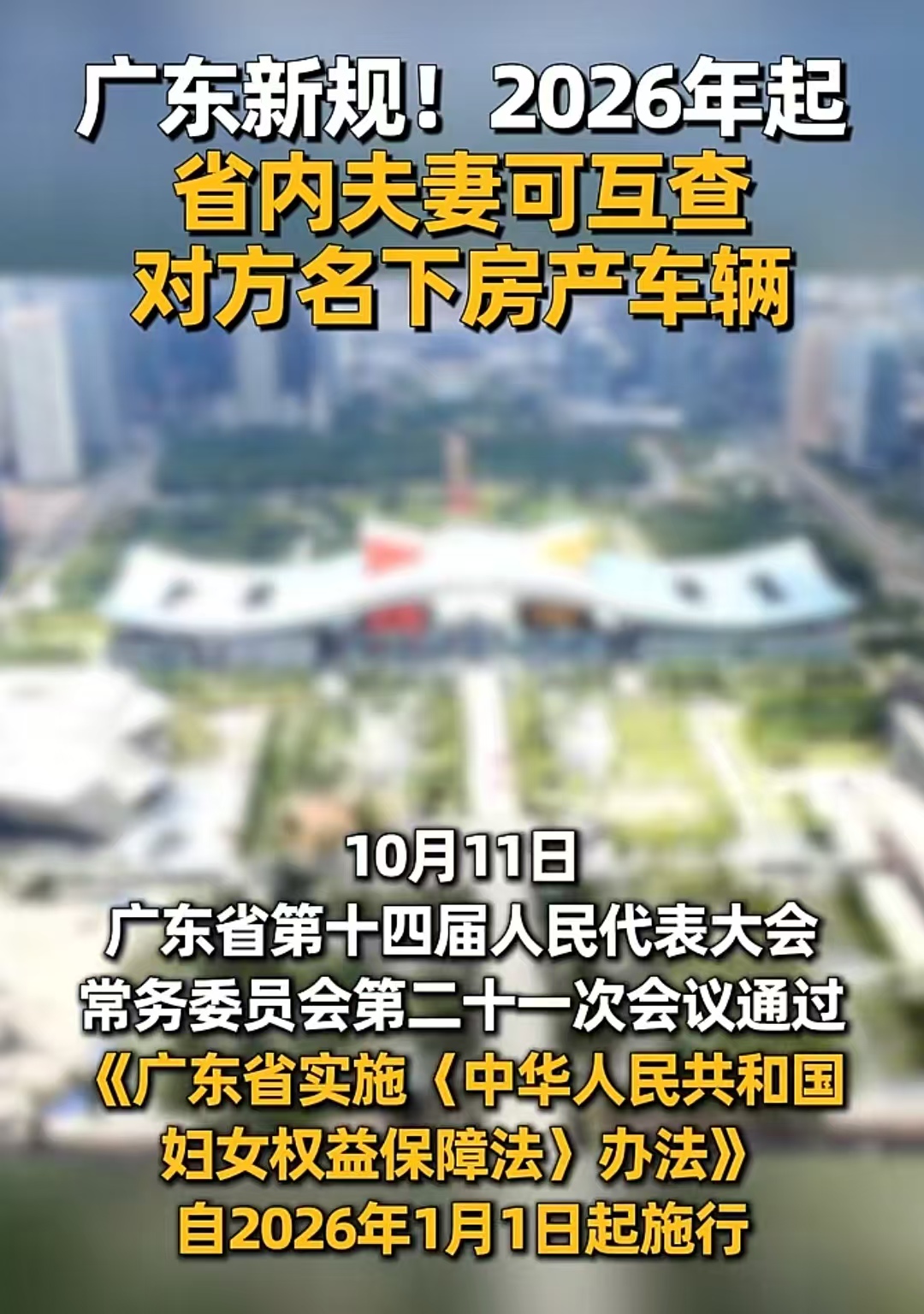 注意! 从明年起 广东省内夫妻可互查对方 名下房产、车辆了 据广东人大网,10月11日,广东省人民代表大会常务委员会发布公告:《广东省实施<中华人民共和国妇女权益保障法>办法》(以下简称《办法》)已由广东省第十四届人民代表大会常务委员会第二十一次会议于2025年10月11日通过,现予公布,自2026年1月1日起施行。 其中,《办法》第四十八条规定:夫妻一方持身份证、结婚证等证明夫妻关系的有效证件,依法向不动产登记、车辆管理单位申请查询另一方财产状况的,有关单位应当受理,并为其出具相应的书面材料。 这意味着自2026年1月1日起,广东省内的夫妻可以互查对方名下的不动产和车辆。 《办法》第四十一条规定:妇女对夫妻共同财产享有与其配偶平等的占有、使用、收益和处分的权利。任何人不得因女方无劳动收入、劳动收入少或者其他理由,限制或者剥夺妇女依法享有的财产权利。 《办法》第五十条规定:夫妻离婚时,不得因女方劳动收入少或者无劳动收入等为由少分或者不分财产给女方。 女方因抚育子女、照料老人、协助男方就学或者工作等负担较多义务的,有权在离婚时要求男方予以补偿。因男方重大过错导致离婚的,无过错的女方有权请求损害赔偿。 此外,《办法》第四十二条提到,妇女在农村集体经济组织成员身份确认、土地承包经营、集体经济组织收益分配、土地征收补偿安置或者征用补偿以及宅基地使用等方面的权利,依法受到保护;任何组织和个人不得以妇女就学、服役、务工、经商、未婚、结婚、离婚、丧偶、户无男性等为由,侵害妇女在农村集体经济组织中的各项权益。任何组织和个人不得以结婚、离婚、丧偶、户无男性等为由,阻挠或者强迫妇女迁移户籍。 《办法》第五十五条还规定,乡镇人民政府、街道办事处应当对村民自治章程、村规民约,村民会议、村民代表会议的决定以及其他涉及村民利益事项的决定进行指导,对其中违反法律、法规和国家政策规定,侵害妇女合法权益的内容责令改正。 《办法》全文如下 第一章 总 则 第一条 为了实施《中华人民共和国妇女权益保障法》,结合本省实际,制定本办法。 第二条 保障妇女的合法权益是全社会的共同责任。本省贯彻落实男女平等基本国策,采取必要措施促进男女平等,消除对妇女一切形式的歧视,禁止排斥、限制妇女依法享有和行使各项权益,保护妇女依法享有的特殊权益。 鼓励妇女自尊、自信、自立、自强,提升法治意识,运用法律维护自身合法权益。 第三条 坚持中国共产党对妇女权益保障工作的领导,建立健全政府主导、各方协同、社会参与、家庭支持的保障妇女权益工作机制。 县级以上人民政府应当制定和组织实施本行政区域的妇女发展规划,将其纳入国民经济和社会发展规划,并将妇女权益保障所需经费列入本级财政预算,建立与经济社会发展水平相适应的保障机制。 县级以上人民政府负责妇女儿童工作的机构负责组织、协调、指导、督促有关部门做好妇女权益保障工作,推动实施妇女发展纲要、规划,协调解决妇女权益保障工作的重大问题和事项。 县级以上有关部门在各自职责范围内做好妇女权益保障工作。 乡镇人民政府、街道办事处应当统筹配备工作力量,做好本辖区内妇女权益保障工作。 第四条 各级妇女联合会依照法律、法规和中华全国妇女联合会章程,代表和维护各族各界妇女的利益,向各级国家机关提出妇女权益保障方面的意见和建议,做好维护妇女权益、促进男女平等和妇女全面发展的工作。 各级人民政府应当为妇女联合会依法履行职责提供必要的条件。 第五条 村民委员会、居民委员会应当依法保障妇女的权益。 第六条 本省建立健全妇女发展状况统计调查制度,完善性别统计监测指标体系,加强部门性别统计工作,推进性别统计监测制度化建设,定期开展妇女发展状况和权益保障统计调查和分析,发布有关信息。 第七条 鼓励和支持企业事业单位、社会组织以及个人通过捐赠、资助或者提供志愿服务等方式,依法参与保障、维护妇女权益工作。 各级人民政府及有关部门、符合规定的群团组织可以依法通过购买服务、项目合作等方式,委托具备条件的企业事业单位、社会组织等为妇女提供法律、心理、婚姻家庭、就业创业等方面的专业化、个性化服务。 第八条 各级人民政府及有关部门、群团组织应当组织宣传男女平等基本国策和保障妇女权益的法律、法规、政策,增强男女平等意识,培育尊重和关爱妇女的社会风尚。 学校、幼儿园应当进行男女平等教育,引导学生树立男女平等的思想观念。 广播、电视、报刊、互联网等媒体应当开展男女平等和妇女权益保障的公益宣传,并加强舆论监督。 第九条 县级以上人民政府按照国家和省的有关规定,对保障妇女合法权益成绩显著的组织和个人给予表彰和奖励。 第十条 本省加强与香港特别行政区、澳门特别行政区在妇女权益保障领域的合作,推动粤港澳地区妇女组织以及妇女间的交流,促进粤港澳大湾区妇女事业融合发展。 第二章 政治权利 第十一条 各级人民代表大会换届选举,应当做好妇女代表候选人的推荐工作。各级人民代表大会的代表中,应当保证有适当数量的妇女代表,并按照国家规定,逐步提高妇女代表的比例。 各级人民代表大会常务委员会组成人员中,应当