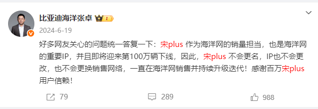2024年6月,张卓在微博发文表示:“宋PLUS作为海洋网的销量担当,也是海洋网的重要IP,并且即将迎来第100万辆下线,因此,宋PLUS不会更名,IP也不会更改,也不会更换销售网络,一直在海洋网销售并持续升级迭代。”