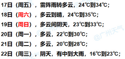 据@广州天气,16日夜间,受弱冷空气和偏东气流共同影响,预计广州傍晚到午夜有雷阵雨;17-18日多云间晴为主,最高温34~35℃;19日起受冷空气和热带气旋外围环流影响,云量增多,气温下降。