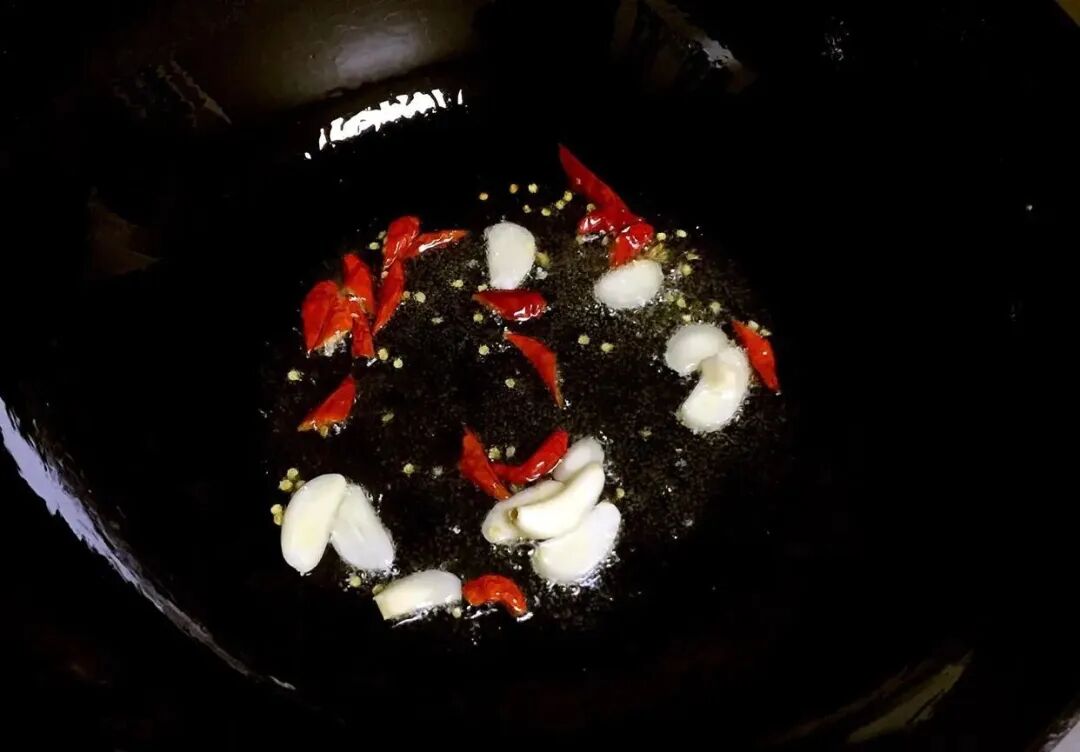 爆香调味料:锅热后加入冷油,用小火将蒜片和干辣椒段翻炒至香味四溢。