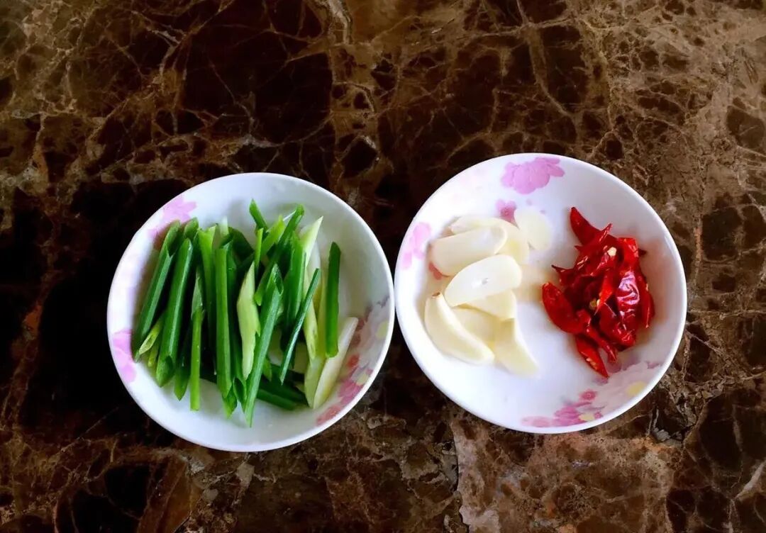调味食材准备:将小葱洗净后切成段,大蒜切成薄片,干辣椒也切成段,这样炒出来的香味更加浓郁。