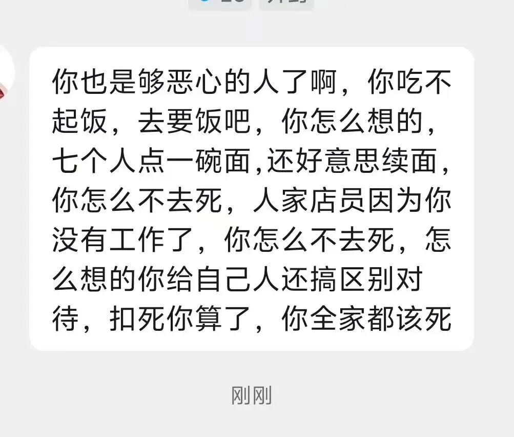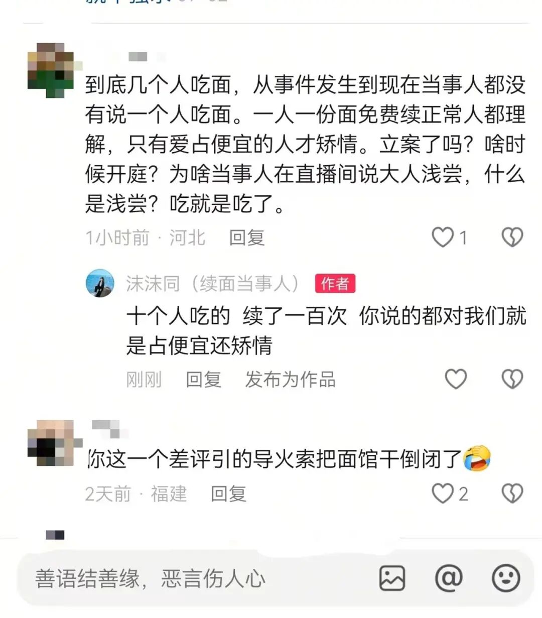 马女士接受极目新闻记者采访时表示,她和家人因为此事遭遇的网络暴力到现在都没有停止。“店老板发布视频后,我们大人和孩子面部被曝光,随即遭遇铺天盖地的谩骂、网暴,身心遭到严重伤害。”马女士称,有人说她故意敲诈,拿孩子当工具;后面还说她哭惨,素质低下;指责她把自己说成是受害人,称她不要脸;还阴阳她一个评论把面馆给干倒闭了等等。甚至还有人骂她的孩子,将一些网传的不实信息添油加醋地写成小作文在网络上传播,直到现在10月了都还挂在网上。