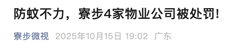 当前正值"两热"等虫媒传染病高发季节,10月15日,寮步微视报道,寮步房地产管理所执法人员在排查中发现,部分小区物业服务企业未严格履行“两热”疫情防控责任,检查对包括深圳市金地物业管理有限公司东莞新天地华庭物业管理服务中心(新天地华庭)、东莞市万科物业服务有限公司城市高尔夫花园物业服务中心(万科城市高尔夫花园)在内的四家物业公司作出不良行为扣分处理。