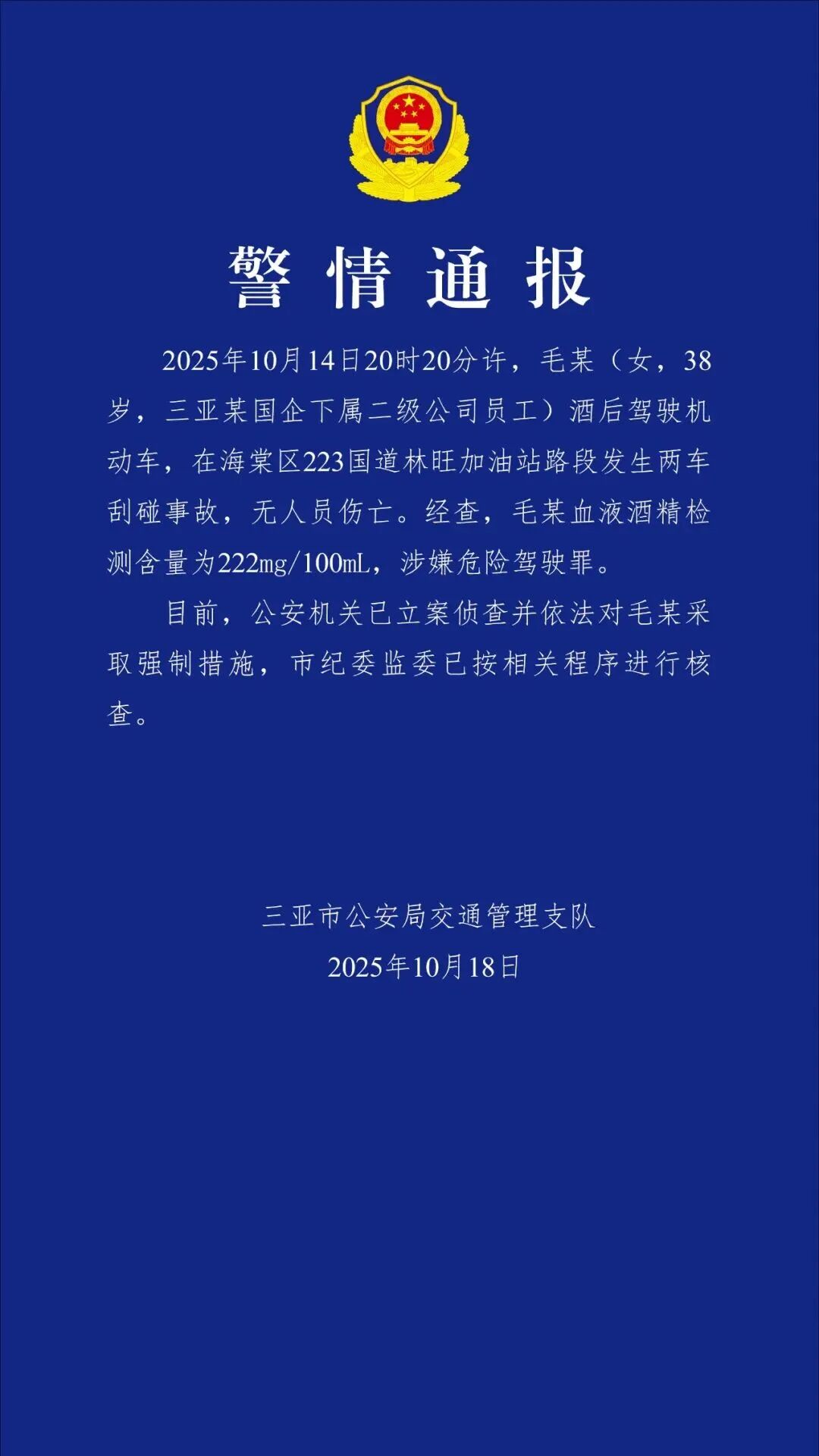 2025年10月14日20时20分许,毛某(女,38岁,三亚某国企下属二级公司员工)酒后驾驶机动车,在海棠区223国道林旺加油站路段发生两车刮碰事故,无人员伤亡。经查,毛某血液酒精检测含量为222mg/100ml,涉嫌危险驾驶罪。