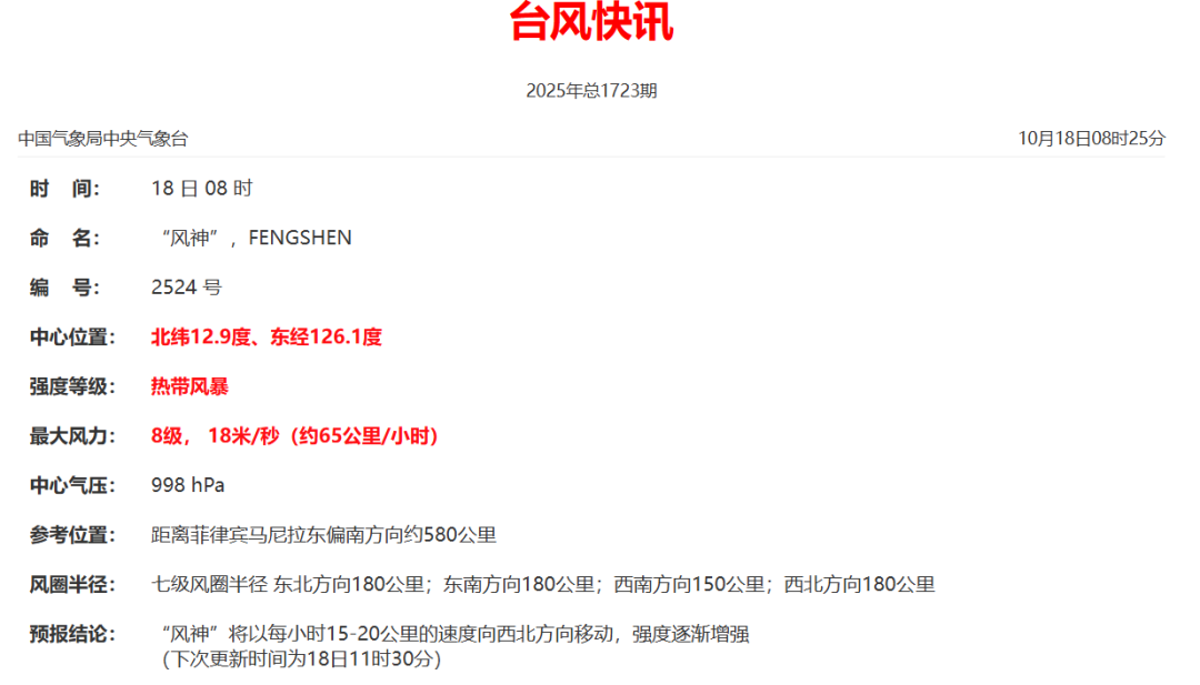 菲律宾以东洋面热带低压已于18日凌晨加强为今年第24号台风“风神”(热带风暴级;英文名称:Fengshen;名字来源:中国;意义:神话中的风之神),8点钟其中心位于菲律宾马尼拉东偏南方约580公里的洋面上,就是北纬12.9度、东经126.1度,中心附近最大风力有8级(18米/秒),中心最低气压为998百帕,七级风圈半径150-180公里。