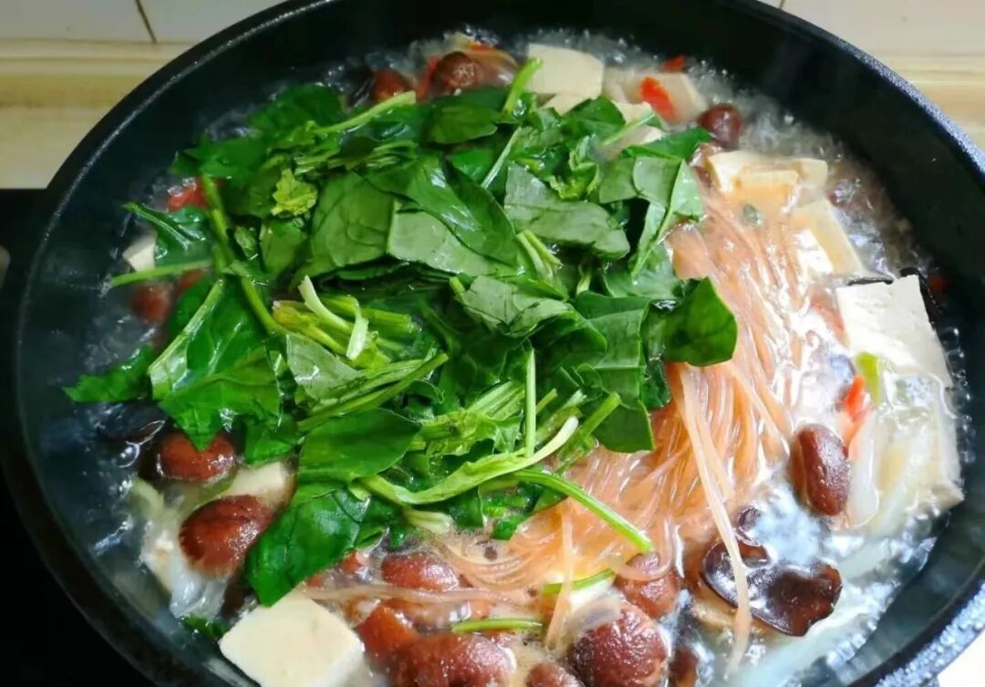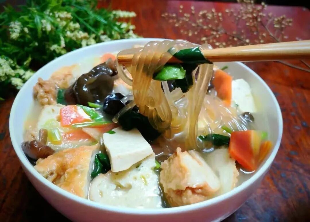 秋季天气渐渐寒冷,这种大烩菜有菜有汤,一碗下去,浑身就有说不出的舒服,全身内外热乎乎地,感觉非常惬意。 食材:我用了豆腐1块、现炸的素丸子1大碗、菠菜几根、胡萝卜半根、泡好的粉条1把、木耳半碗、香菇半碗、土豆1个、香菜几根、葱半根(这是4个人吃饭的量)盐,鸡粉和胡椒粉。 做法: 1、提前一晚用凉水,取1把粉条,半把木耳,半把干香菇泡软。 2、这是我早上起来拌的面糊现炸的丸子,用了200克面粉,2个鸡蛋,半勺盐,半勺五香粉,葱末混合加水搅拌成浓稠的面糊,用筷子夹小块放油锅里小火炸金黄即可,做了一大盆。 3、丸子炸好后,准备其它配菜,胡萝卜,土豆去皮切片,菠菜洗净切段。 4、准备一块豆腐冲洗也切片,香菜切段,大葱切片。 5、炸好的丸子,切成不规则的大块。 6、另起锅添入半勺食用油,放入葱片炒香。 7、添加半锅的清水,水烧开后,放入豆腐,胡萝卜土豆片,香菇,木耳炖煮10分钟。 8、再放入粉条,菠菜段。 9、接着加入半碗水淀粉拌匀,煮1分钟左右。 10、最后放入素丸子,香菜。 11、开始调味,1大勺盐,1小勺鸡精,1勺胡椒粉搅匀煮开,关火焖5分钟即可。 12、烩菜的菜可以放自己喜欢的任何菜,不想做饭了,用它来搭配做一锅有菜有汤的饭,既节省时间又营养,也不需要多少技巧。