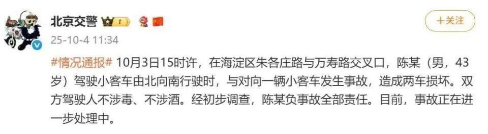 2025年10月3日下午,有网友曝出图片,称车评人陈震发生交通事故。北京市交管部门于10月4日通报,事故双方均未涉酒涉毒,陈某负事故全部责任。