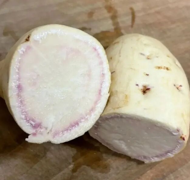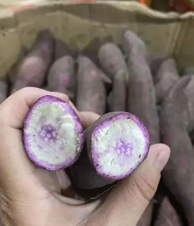 澳洲紫白是最近几年比较火的甘薯,软糯香甜,吃后还有淡淡的奶香味,有人称作牛奶芋,在众多高端红薯品种中脱颖而出,成为备受追捧的明星,被誉为“紫霞仙子”。所产薯块形态修长,呈纺锤形。淡白外皮,薯肉外圈紫色芯白色,适合烧烤和蒸煮,沙壤软甜,回味无穷。