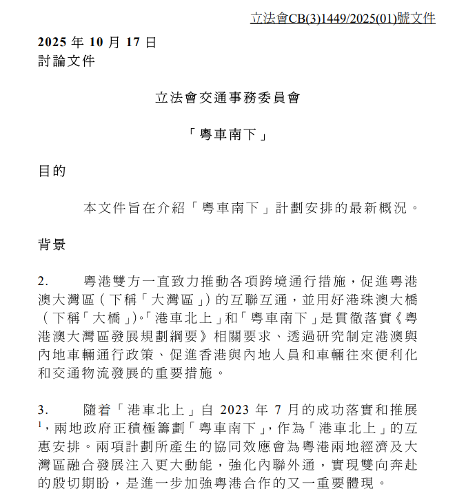 10月14日,运输及物流局正式公布“粤车南下”安排,预计最快下个月正式实施。