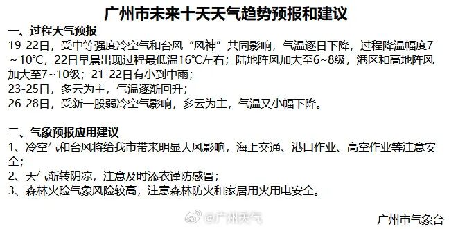 据@广东天气,台风“风神”今日(19日)傍晚前后将进入南海,强度逐渐增强。受台风和冷空气共同影响,19-22日广东省海陆风力加大,部分市县气温自北向南逐渐下降,过程降温幅度约6~10℃。