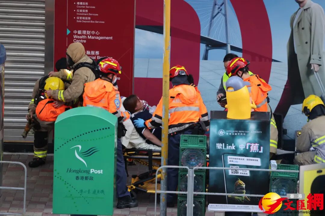 其中一人不 适送院。(香港文汇报记者邓伟明摄) 据网上片段及图片显示,初时在华懋大厦后巷的火势较大,其后愈烧愈烈,熊熊烈火沿棚架向上和四周蔓延,大量烟灰连同烧断竹棚飞坠路面,有停泊路旁的车辆被竹棚砸中。 巴士电车服务受阻 多条巴士路线改道 受事 故影响,途经上址一带的巴士及电车服务受阻,多条巴士路线需要改道,干诺道中往上环的车龙龙尾一度伸延至夏悫道。干诺道中往上环方向近毕打街全线、德辅道 中(来回方向)介乎域多利皇后街及砵典乍街全线需要封闭。
