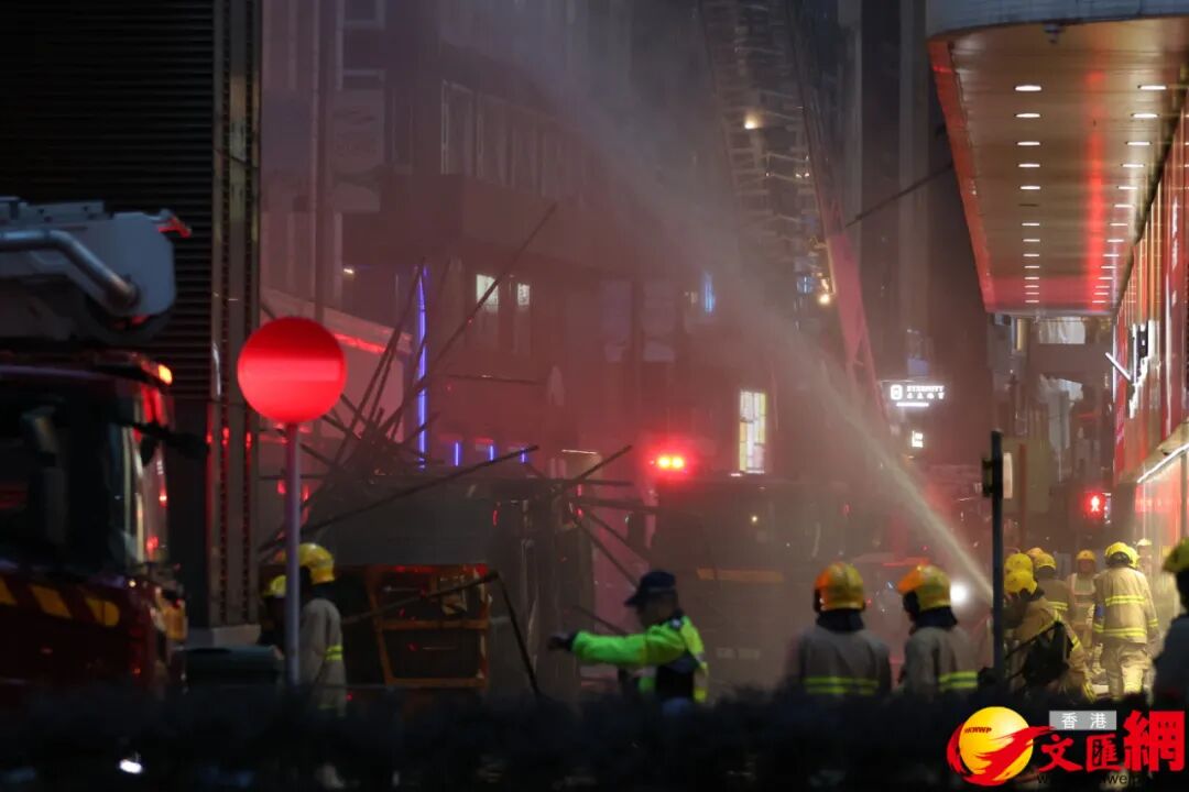中环大火第二天:184名消防员的身影,依旧在现场轮班值守。危难中逆行,烟尘中守护,致敬这群最可爱的人!香港文汇报记者刘友光摄 香港文汇报记者刘友光摄 中环干诺道中34号至37号华懋大厦外墙棚架昨日下午4时许起火, 火势乘风势瞬间将大厦包围,浓烟直卷半空 ,维港对岸亦清晰可见。 消防员到场 灌救及将火警升为三级,出动184名消防员和救护员扑救和救援。火警中有58人自行疏散,6人一度被困华懋大厦和毗邻大厦,其后安全获救,其中4人因吸入浓烟及擦伤送院治理,其中2男子留医深切治疗部。消防员在晚上9时13分大致将火救熄,深夜仍持续向火场射水降温。消防处火警调查队正调查起火及火势蔓延迅 速的原因。消防员昨晩继续向火场射水降温。香港文汇报记者万霜灵摄