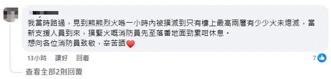 评论区被网友「辛苦了,感谢」刷屏,纷纷为消防员点赞。 高级救护主任袁浩章表示,该宗火警中共有3男一女送院,其中在华懋大厦3楼至4楼梯间被救出的男子伤势较为严重。消息指,伤者中有建筑工人。 别人跑下楼,他们冲上楼;别人戴口罩,他们背30斤氧气瓶。原来「超级飞侠」真的存在,只是今天没穿橙色飞机服,穿的是防火服!