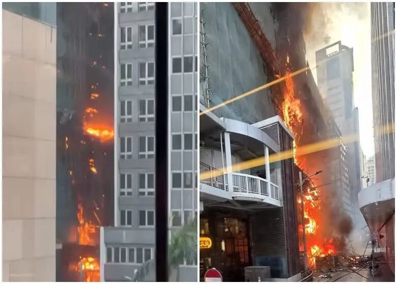 大厦外墙棚架起火,火势猛烈。文汇报记者孙嘉蔚摄(左)及网上图片(右) 大厦外墙棚架起火,火势猛烈浓烟冲天。(读者提供)