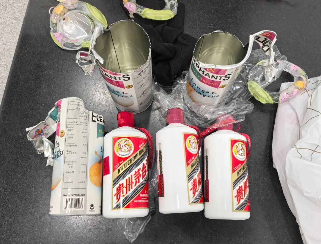 随后,关员发现袋内装有塑封完整的一提3罐“糖水龙眼”罐头,罐口均无开封使用痕迹,但重量异常,初步判定有藏匿物。打开后发现,每个罐头内均被塞进了一瓶茅台酒,共计3瓶。