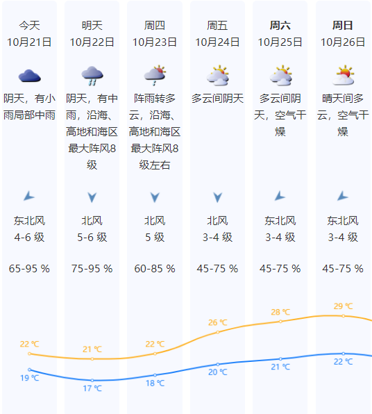 受冷空气和“风神”共同影响,21至23日深圳市将有明显大风和降温天气,并伴有降雨,沿海和高地最大阵风8-10级,最低气温降至17℃左右,体感明显转凉。