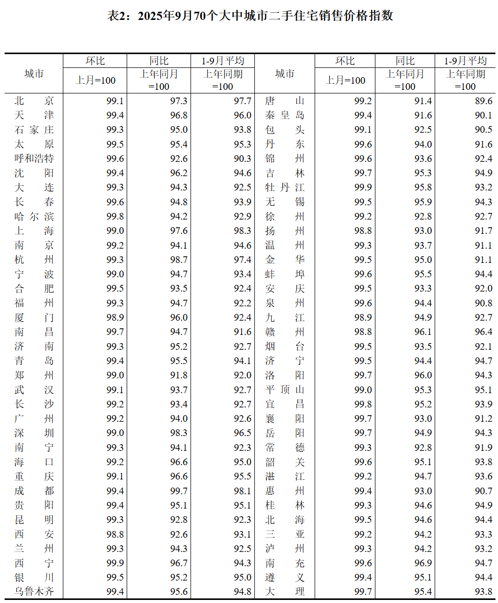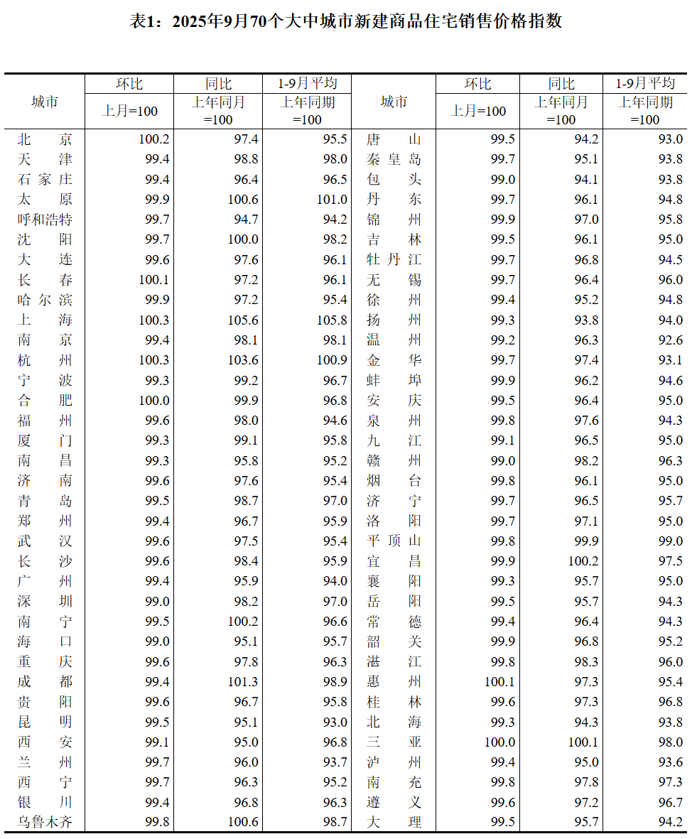 《2025年9月份70个大中城市商品住宅销售价格变动情况》。