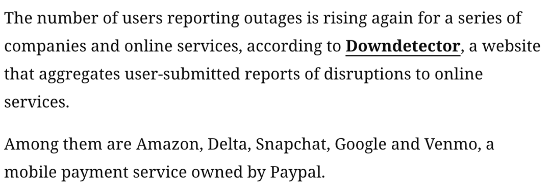 目前,针对一系列公司和在线服务报告中断的用户数量再次上升。其中包括亚马逊、Delta、Snapchat、谷歌以及 Paypal 旗下的移动支付服务 Venmo。