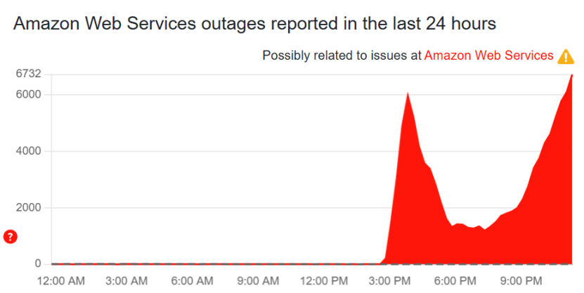 此次故障首先影响了位于弗吉尼亚州北部的亚马逊US-EAST-1区域,并逐渐波及到其他地区。根据监测网站Downdetector的数据,故障于美国东部时间凌晨3点左右开始出现。