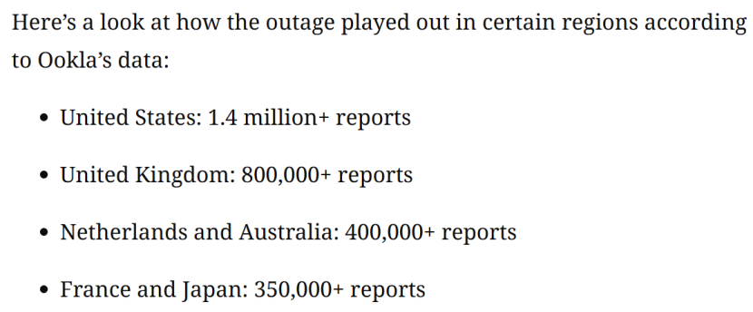 仅在故障发生后的前2小时,就有超过100万条报告来自美国。英国也在同一时间段内提交了超过40万条报告。