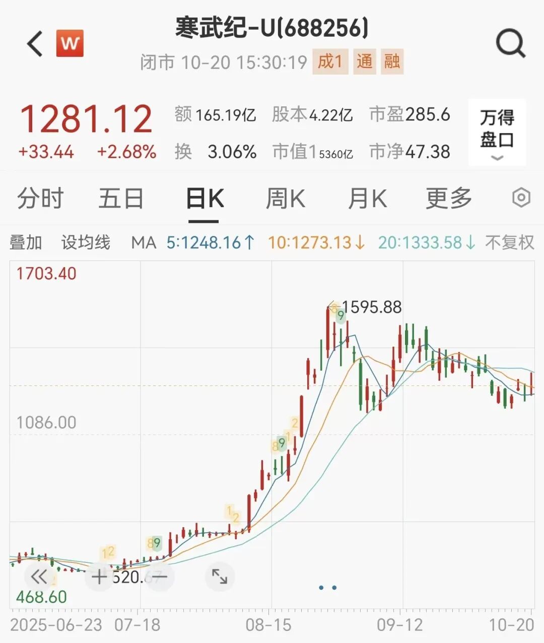 21世纪经济报道记者注意到,上述公告发布后,寒武纪股价开始震荡走低。截至10月20日收盘,寒武纪股价报1281.12元/股,总市值5360亿元。