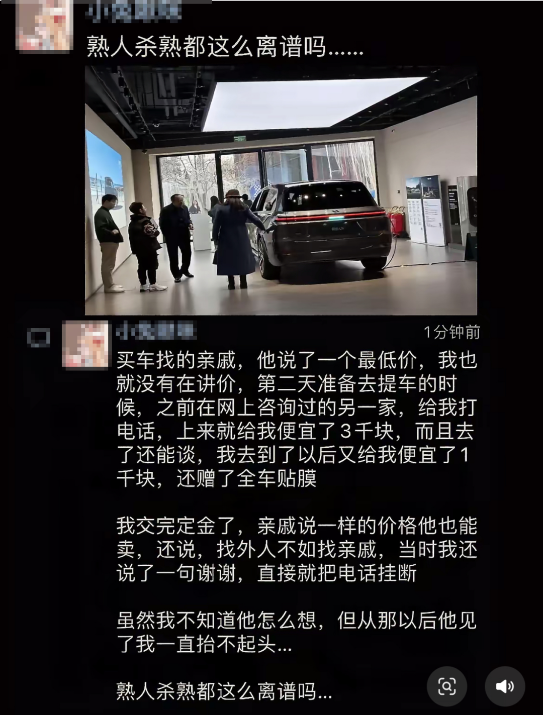 “买车找的亲戚,给我报了个最低价。结果第二天准备去提车的时候,另外一家打电话过来报价,同款车比熟人的便宜3千,而且去了还能谈,到那之后又给便宜了1千块,还赠送全车贴膜。”