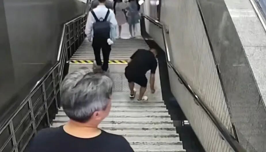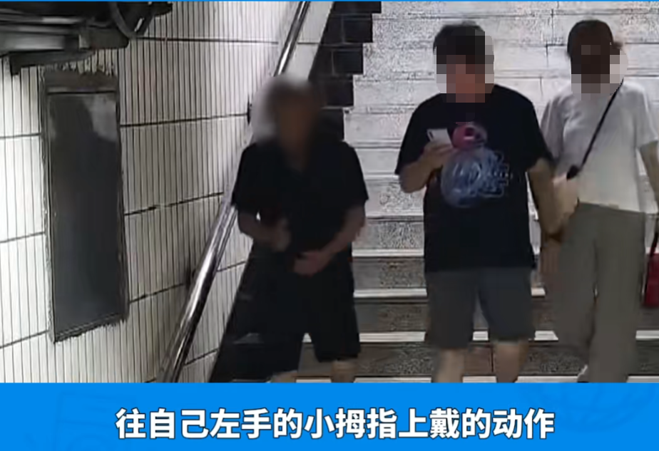 不久后有一男子在站台楼梯上弯腰拾取了什么东西,并且有把东西往手指上套的动作。