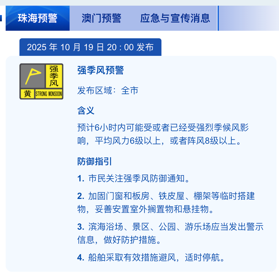 珠海于今日发布了强季风预警。预计6小时内可能受或者已经受强烈季候风影响,平均风力6级以上,或者阵风8级以上。
