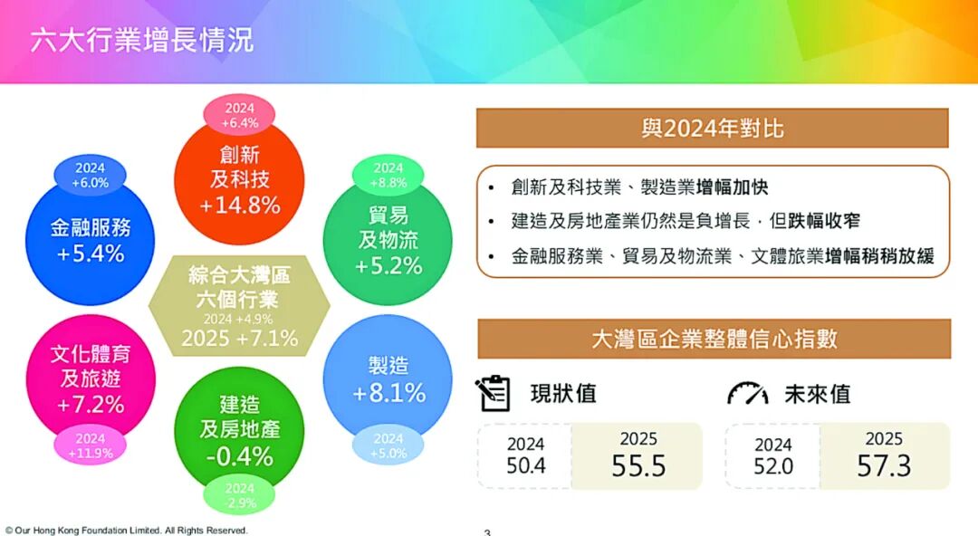 是次访问到逾3400间大湾区企业,以提供多维度、科学化的评估。指数显示,大湾区综合六个重点行业的按年增长率由去年的4.9%加快至今年的7.1%,创新科技成为增长的火车头(+14.8%),制造业持续迈向智能化发展致高增长(+8.1%),建造及房地产跌势放缓,由去年-2.9%收窄至-0.4%,其他行业发展则步伐稳健。