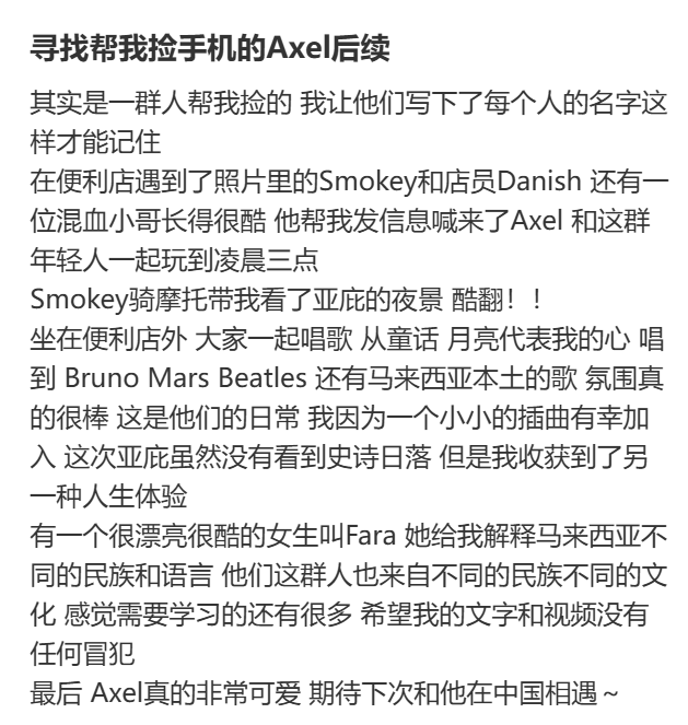 原来,一群当地年轻人捡到袁女士手机,在手机里留下了这段影像:“你的手机丢啦,我们帮你保管哦,等你找回手机,可以把这段视频发到中国的抖音上吗?”