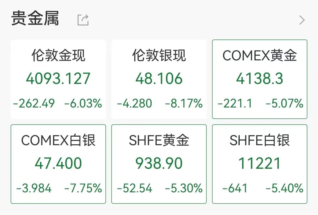10月21日晚间,现货黄金持续跳水,截至22:47,现货黄金日内跌幅扩大超6%,报4093.127美元/盎司,创四年来最大跌幅。现货白银跌8.17%,报48.106美元/盎司。