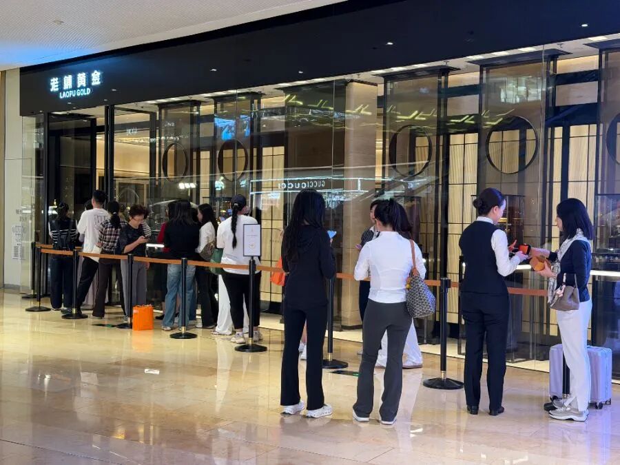 同日上午,据21世纪经济报道记者实探,广州太古汇老铺黄金门店爆火,再现排队长龙。现场负责接待的销售人员不时与排队的顾客沟通确认,排队时长在1.5小时左右,需要耐心等待。