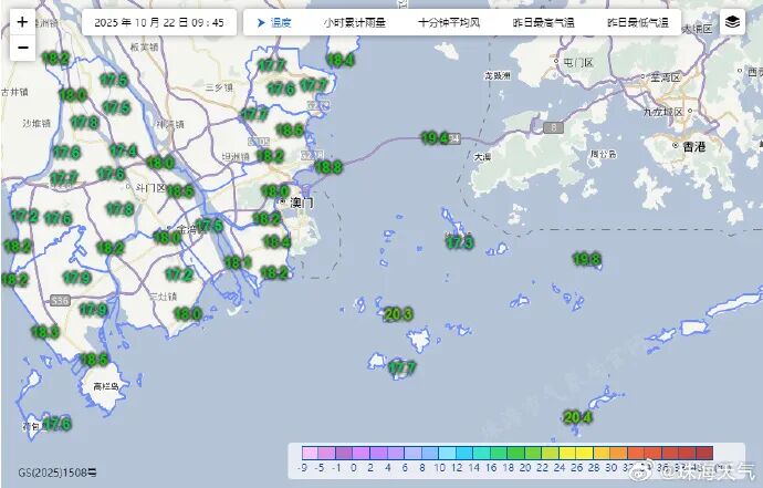 : 在冷空气与绵绵细雨的叠加影响下,让今天的凉意比数值上更显真切。早上气温普遍徘徊在17~18℃,这样的清凉还会延续到明天,早晨有零星小雨,凉感依旧是主角。(10月22日09时45分珠海气温实况图)24日起阳光增多,气 ...