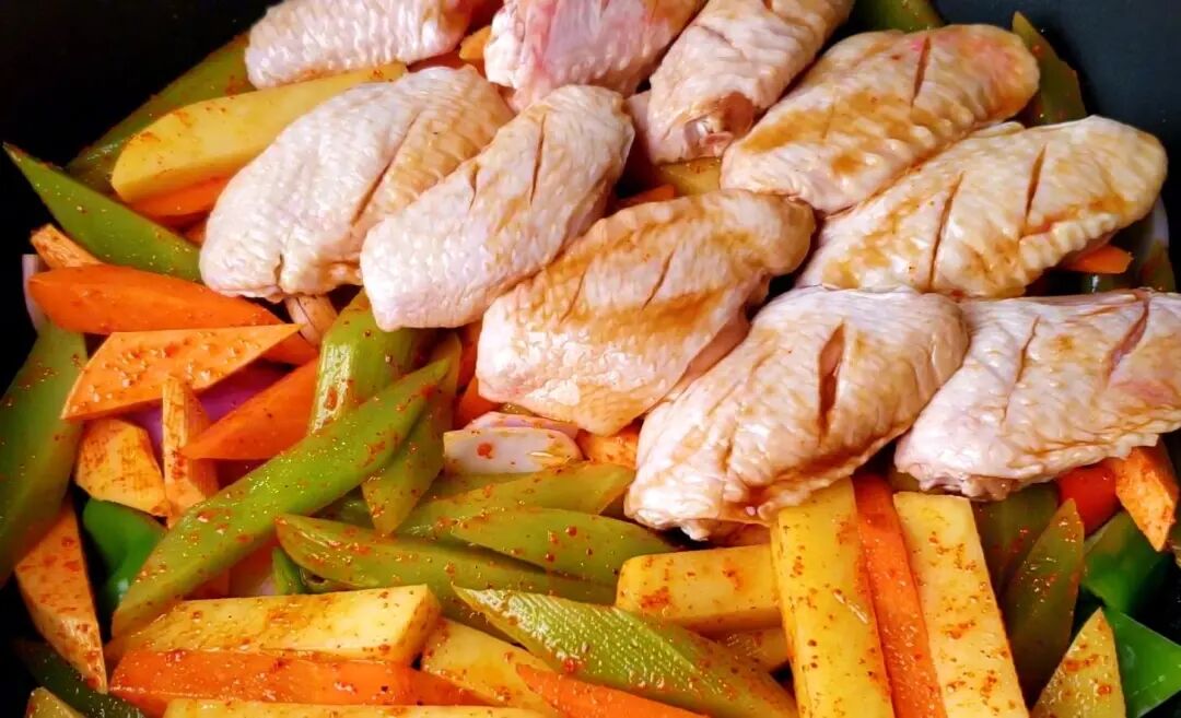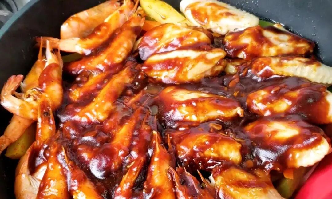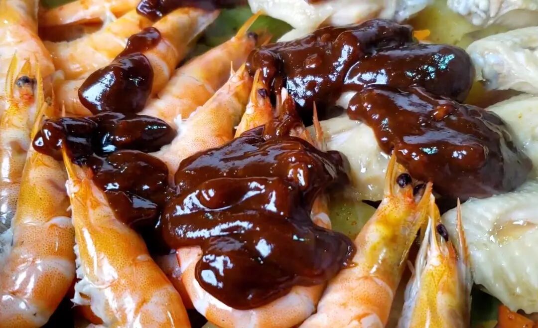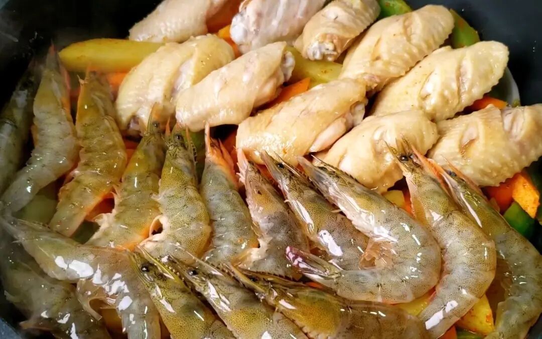 今天把三汁焖锅做法分享给大家,做法简单易学,这样做出来的三汁焖锅酱香十足,开胃下饭,比饭店的还要好吃。 做法: 1,准备好大虾清洗干净剪去虾须,用牙签挑出虾线,加入一勺食盐,一勺料酒抓拌均匀腌制10分钟。 2,准备好几个鸡翅清洗干净,两面划上两刀方便入味,加入料酒,生抽,食盐,抓拌均匀腌制15分钟。 3,准备好一个大土豆去皮后切成小条,一根红薯去皮后切成小条,一根莴笋去皮后切成小条,一根胡萝卜去皮切成小条放入盆中,加入一勺食盐,两勺辣椒粉,三勺食用油,搅拌均匀腌制5分钟入味。 4,准备好一个红青椒切成小块,一个洋葱切块,再准备好半头大蒜去皮,一块生姜切成薄片。准备好一个锅倒入切好的配料,翻炒半分钟。 5,再倒入腌好的土豆,红薯,胡萝卜和莴笋,摆放上腌制好的鸡翅,盖上盖子小火焖5分钟。 6,调一个酱汁:碗中加入两勺蚝油,两勺生抽,两勺番茄酱,两勺黄豆酱,一点鸡汁,一勺白糖,一勺甜面酱,少许淀粉,少许胡椒粉搅拌均匀。 7,5分钟后把腌好的大虾也摆放在上面,盖上盖子小火再闷5分钟。 8,5分钟后把调好的酱汁倒入锅中涂抹均匀,盖上盖子再闷10分钟左右。 9,时间到开盖满屋飘香,闻着都让人流口水,也可以再撒上一点芝麻和葱花增香,我们的三汁焖锅就做好了。