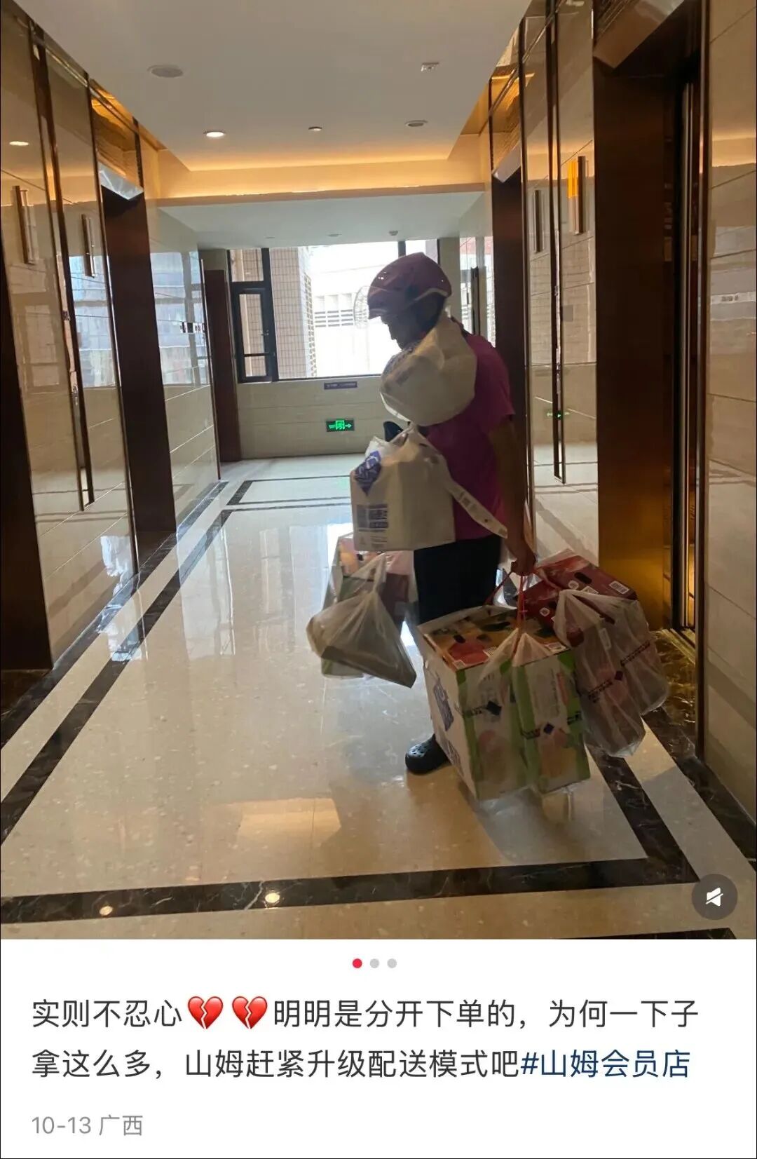京东秒送回应,正与山姆共同加速多项安全举措的落地,增加三轮及四轮等专用车辆以适配大体积订单,全力守护骑士配送安全。