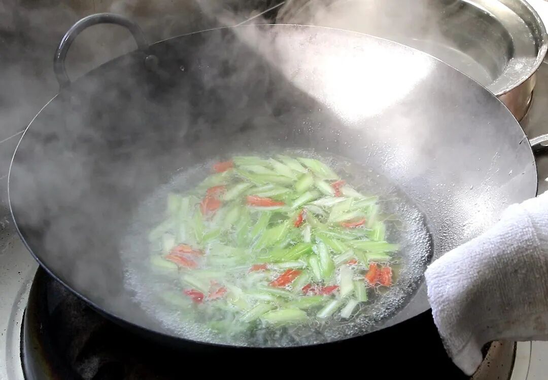 2.锅内加入适量清水,加入少许食盐和植物油,水烧开后倒入切好的芹菜和红椒,焯水分钟左右,芹菜断生后捞出,用清水冲洗冷却备用,清水冲洗能使芹菜口感更脆。