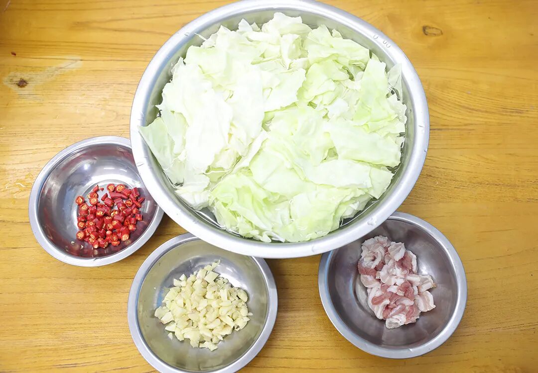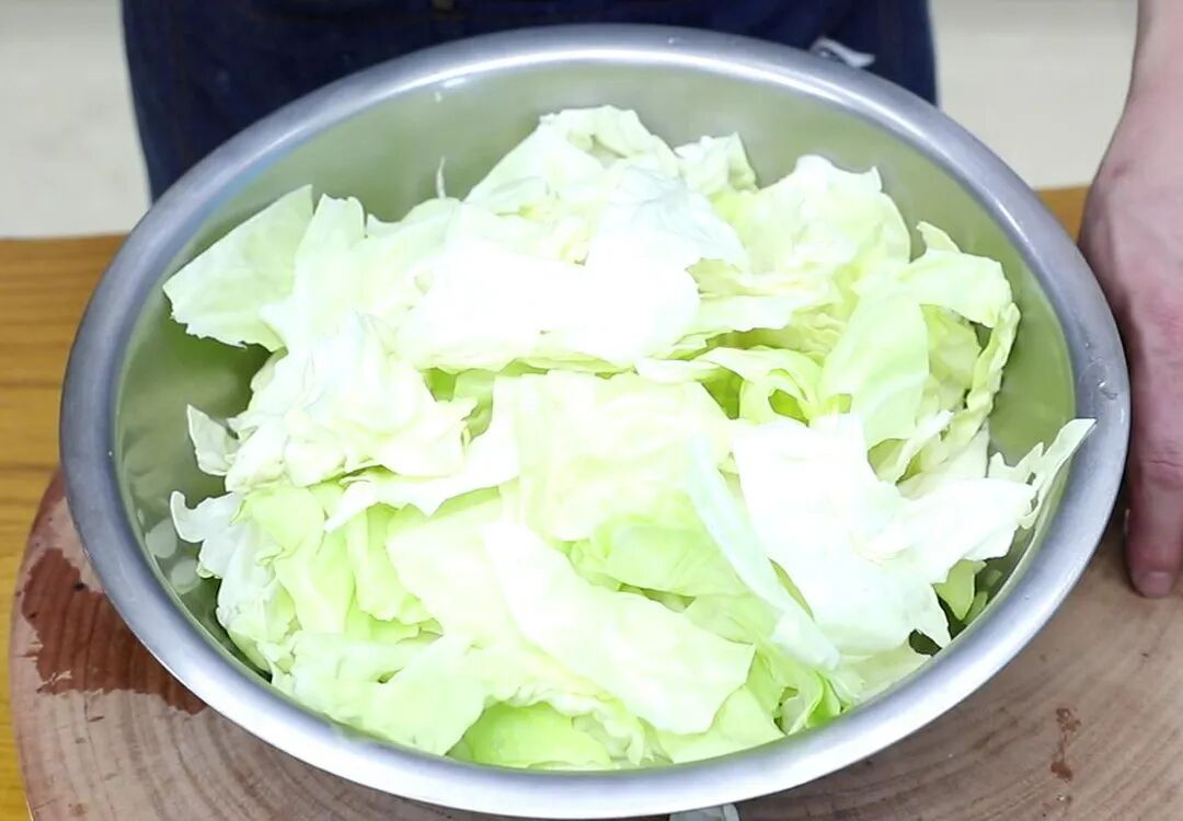 1.把包菜从中间切来,去除硬根,把包菜叶撕成块,里面的硬茎也剔出去不要,做这道菜只用包菜叶,把包菜叶用清水浸泡一会儿,这样吃起来更加清脆。