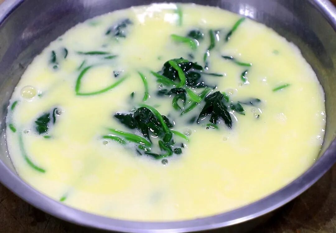 3.把准备好的蛋液倒入菠菜中,倒的时候把蛋液过一下滤网,筛出气泡和没有打碎的蛋清,这样使蒸出的蛋羹更加平整嫩滑。