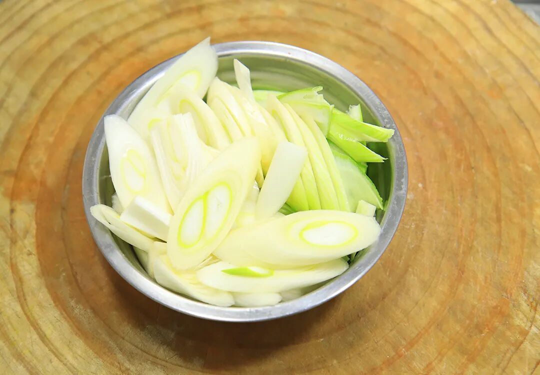 2.准备大葱白2根,斜刀切成片。切点小米椒段、姜丝、蒜片备用。