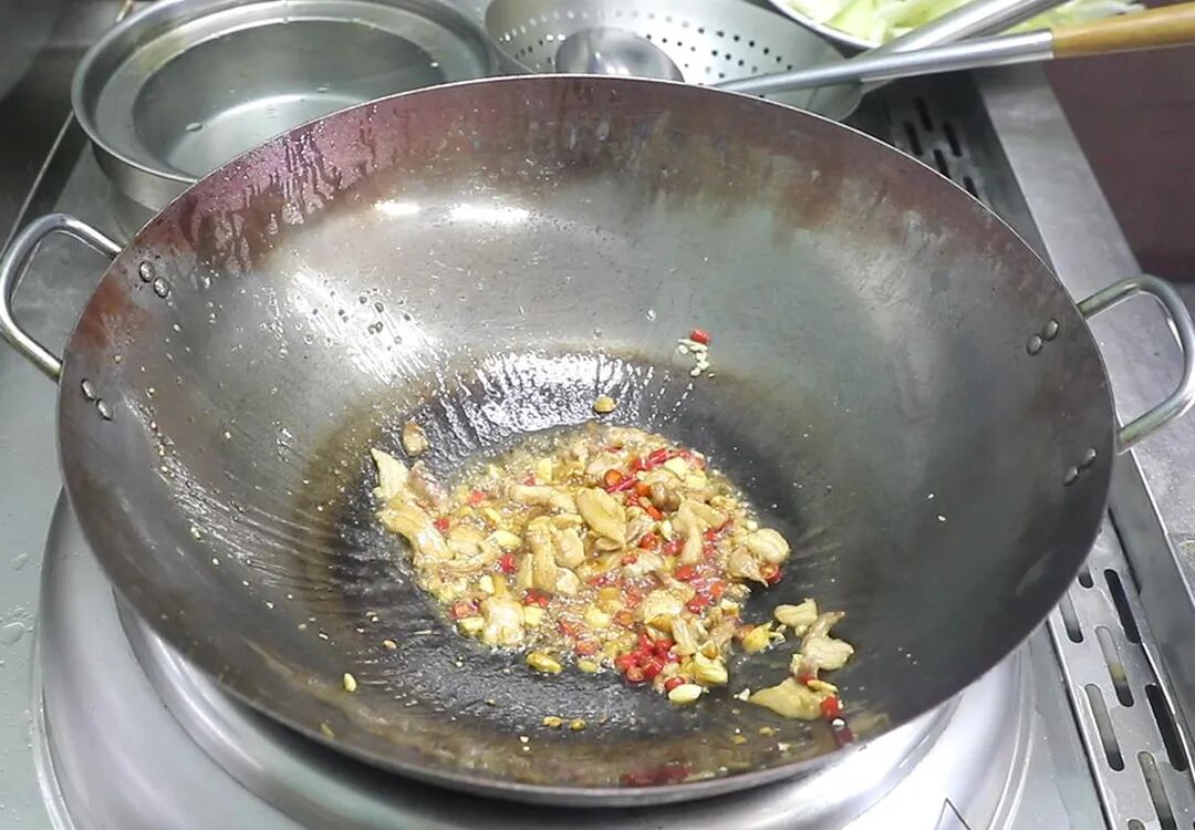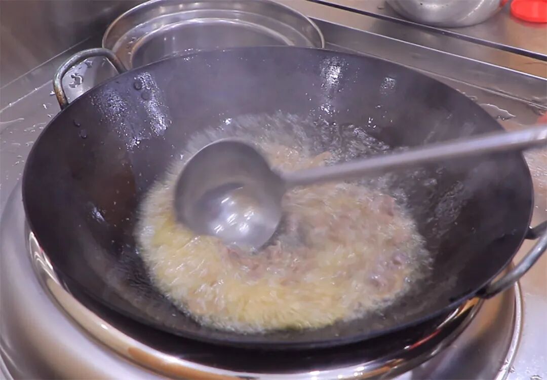 5.锅内烧油,油温4成热时,油面平静不冒烟,把猪肝快速滑炒10秒钟,猪肝变色定型以后倒出来控油。