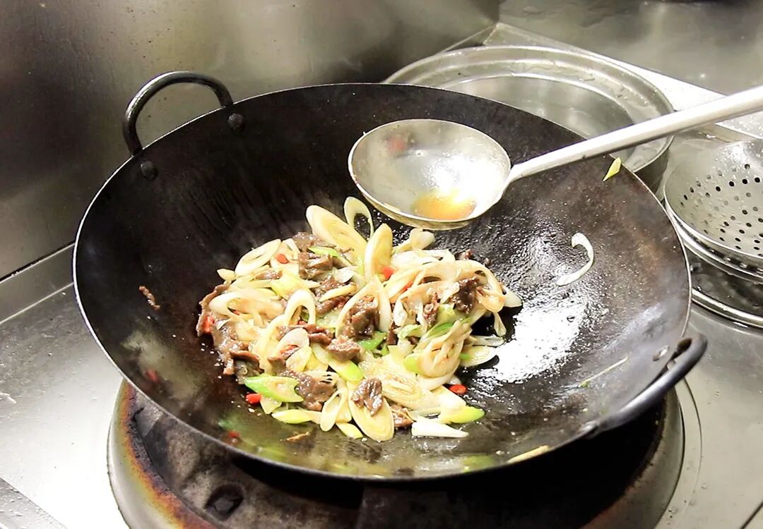 4.加入蚝油3克翻炒化开,倒入切好的葱片,转中火快速翻炒30秒钟,让葱的香味充分融入到牛肉里面,葱片断生以后加入食盐2克,鸡精1克,料酒5克翻炒化开调料。