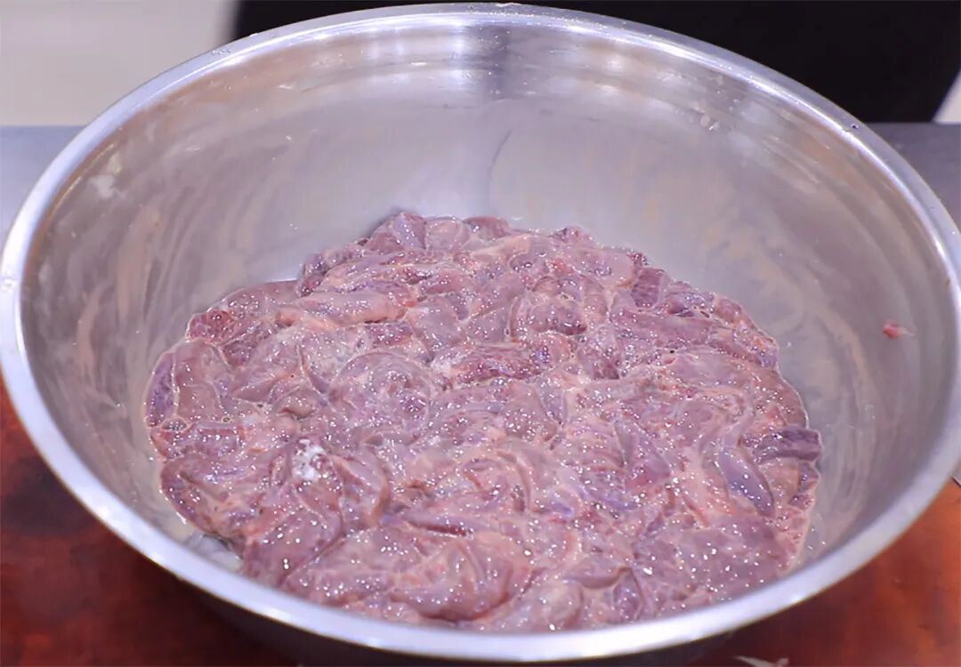 2.10分钟以后把猪肝倒出来,再次用清水冲洗干净,沥干水分,加入一勺食盐入底味,放入一小撮点淀粉抓拌均匀备用。