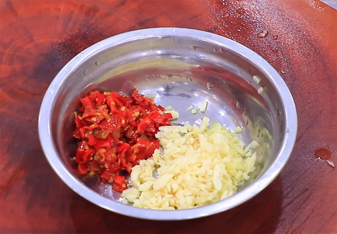 5.切点蒜蓉、红椒粒、线椒圈放在一起,加入食盐2克,味精1克,生抽10克,陈醋5克,明油5克,香油5克,搅拌均匀即可。