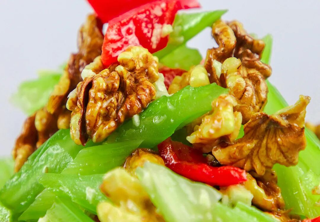 3.准备一个大盆,倒入切好的蒜末,加入食盐2克,味精1克,白醋3克,香油5克,把控干水分的芹菜和红椒倒入盆中,颠盆拌匀,倒入核桃仁再次拌匀后即可装盘,这道清新爽口的西芹拌桃仁做好了。