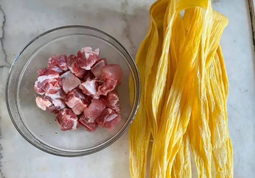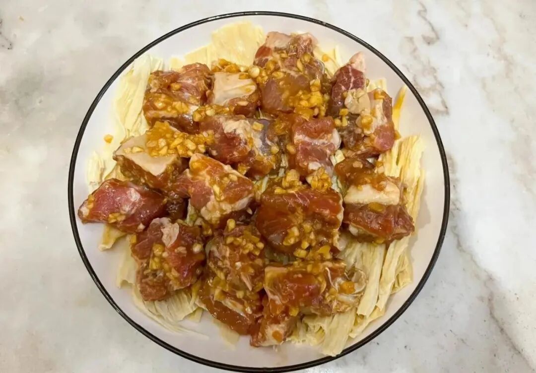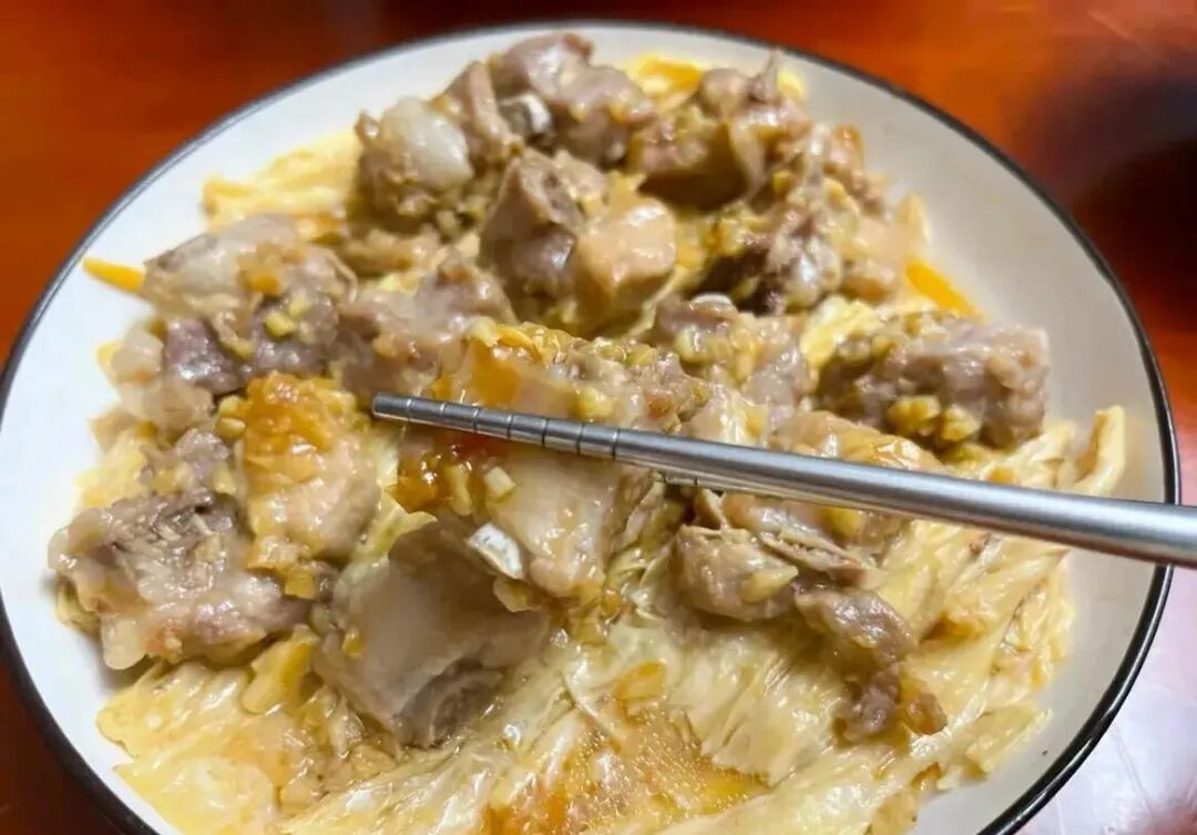 今天分享一道腐竹蒸排骨 非常家常又营养美味的一道菜 排骨蒜香浓郁、鲜嫩入味 腐竹吸满了汤汁软嫩美味 好吃又下饭,家人都爱吃 食材:排骨、腐竹、蒜 调料:花生油、盐、生抽、蚝油、淀粉 排骨加适量淀粉抓洗干净后沥干水分 放入蒜末 加1小勺盐、1勺生抽、1勺蚝油、1勺淀粉、适量花生油 抓拌均匀腌制30分钟 腐竹用清水浸泡,把腐竹泡软后洗净切小段 均匀铺在盘中 再放上腌制好的排骨 水开后放入隔水蒸20分钟 时间到就可以出锅啦 一开盖香气四溢 鲜香美味的腐竹蒸排骨就做好啦 排骨鲜香嫩滑、腐竹软嫩入味 实在是绝佳的搭配 清淡营养又美味下饭 老人小孩都爱吃 大家不妨试试哦... 来源:千厨百味、如有侵权请联系删除